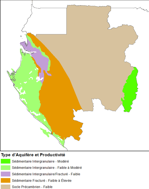 [[File:Gabon_Hydrogeologie.png |500 px| center | thumb| Hydrogéologie du Gabon à l'échelle de 1: 5 millions. Pour plus d'informations sur la façon dont la carte a été élaborée, consultez la [[Hydrogeology Map | page ressources de la carte d’hydrogéologie]] (en anglais).]]