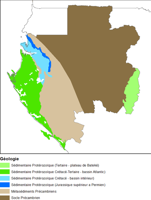 [[File:Gabon_Geologie.png | center | thumb| 500px | Géologie du Gabon à l'échelle de 1: 5 million. Sur la carte carte décrite par Persits et al. 2002 / Furon et Lombard 1964. Pour plus d'informations sur le développement de la carte et les ensembles de données, voir la [[Geology | page de ressource géologique]] (en anglais).]]
