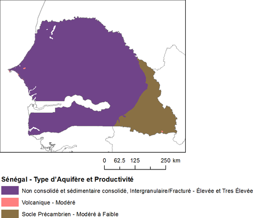 La carte d'hydrogéologie de cette page montre une version simplifiée du type et de la productivité des aquifères au Sénégal, à une échelle de 1: 5 000 000 (voir la [[Africa Groundwater Atlas Hydrogeology Maps | page ressources de la carte d'hydrogéologie]] (en anglais) pour plus de détails).