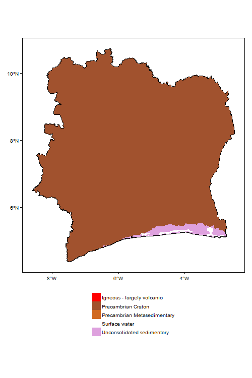 This section provides a summary of the geology of Côte d'Ivoire. More information is available in the report ‘Groundwater in North and West Africa: Côte d'Ivoire’ (UN 1988). (see References section, below).