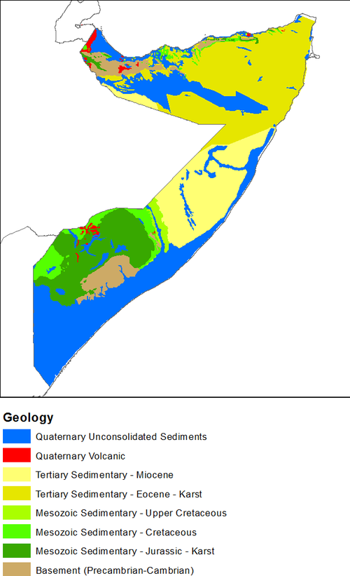 [[File:Somalia_Geology2.png | center | thumb| 500px | Geology of Somalia at 1:5 million scale. Based on map described by Persits et al. 2002/Furon and Lombard 1964. For more information on the map development and datasets see the [[Geology | geology resource page]].]]