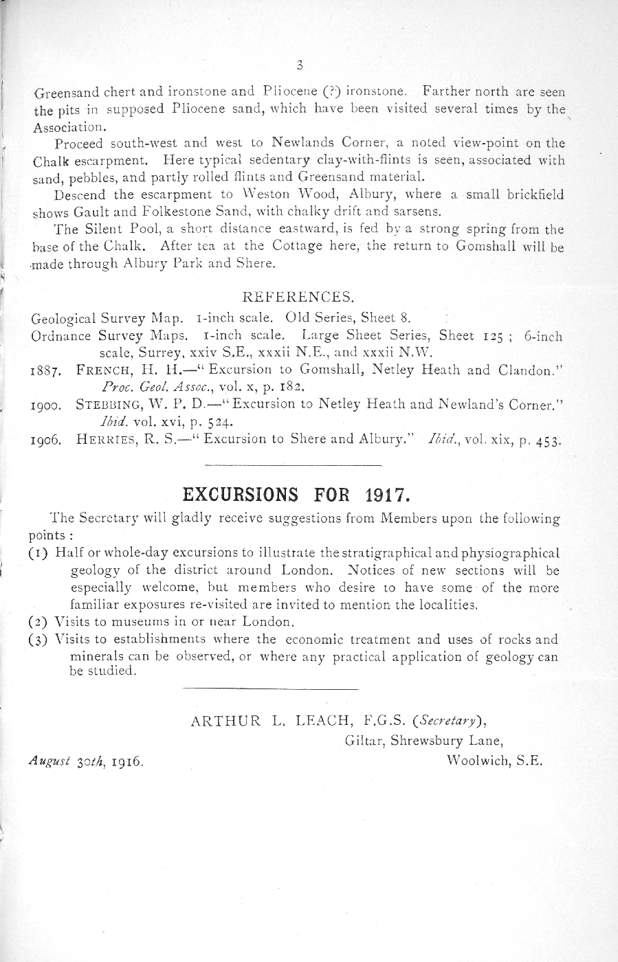 | description | English: Geologists' Association Circular No. 190. Session 1915-1916 p.3. Excursion to Netley Heath, Newlands Corner, and the Silent Pool. Saturday, September 23rd, 1916. |