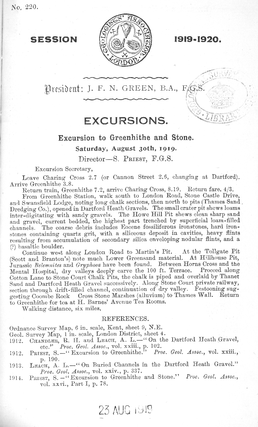 | description | English: Geologists' Association Circular No. 220. Session 1919-1920. p.1. Excursion to Greenhithe and Stone. Saturday, August 30th, 1919. |